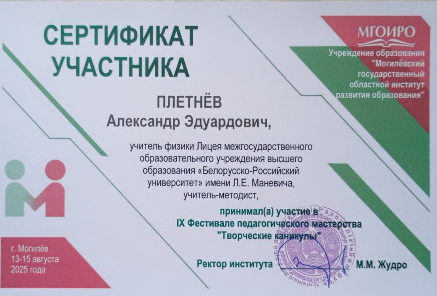 13-15.08.2025 г. прошел девятый областной Фестиваль педагогического мастерства МГОИРО «Творческие каникулы». В рамках этого мероприятия организовал для участников фестиваля Физико-спортивную полосу препятствий и поделился своим опытом по вопросу "Решение графических задач на уроках физики для формирования естественно-научной и математической граматности"