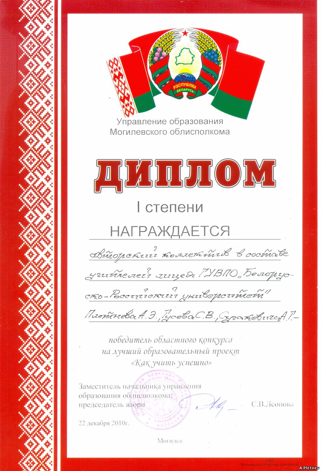 Победитель шестого конкурса методических разработок педагогических работников Республики Беларусь "Открытый урок 2010"
